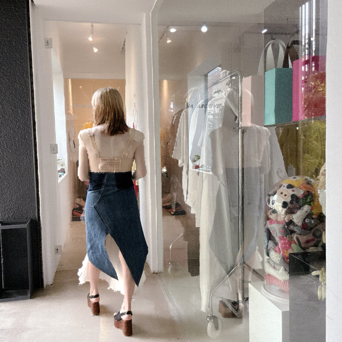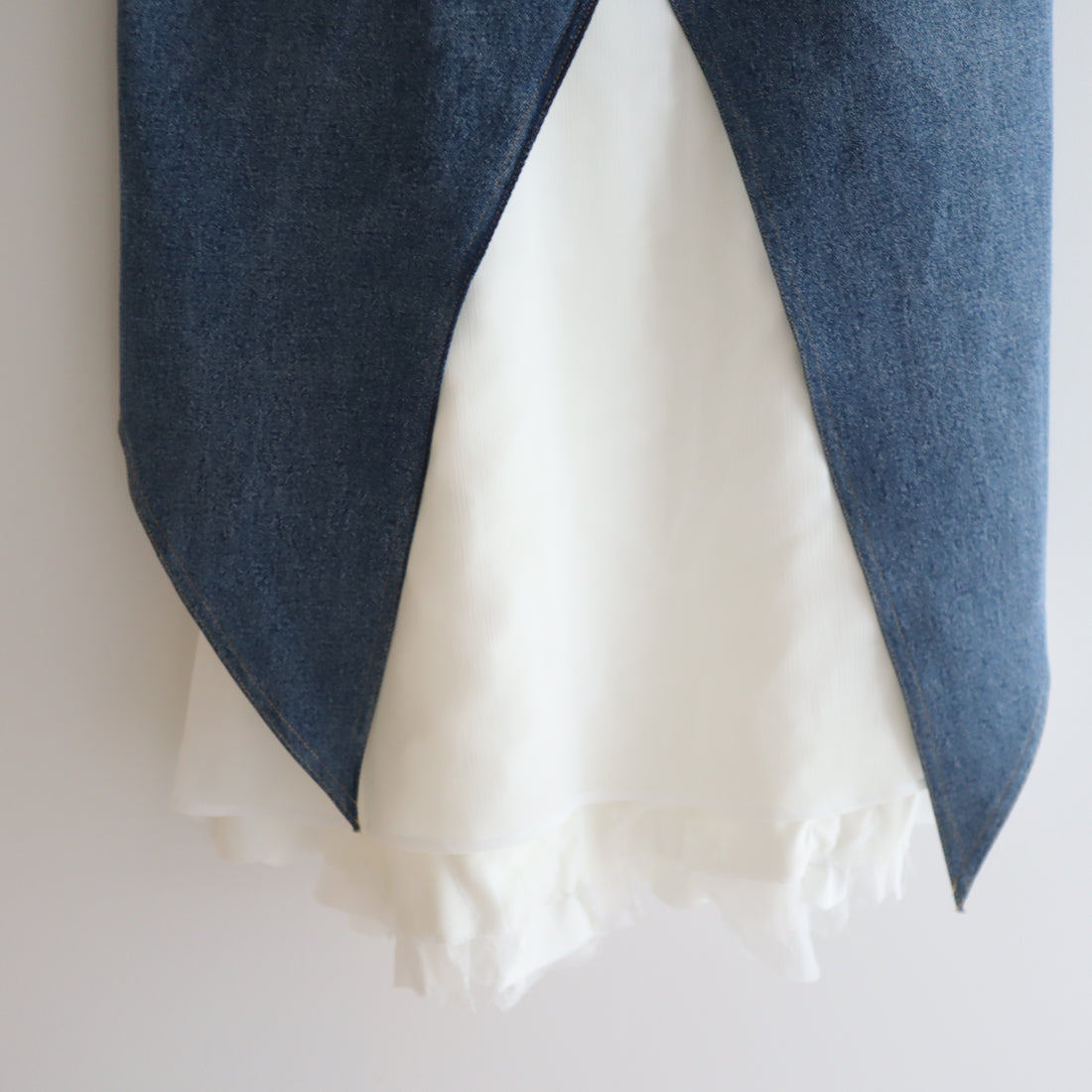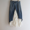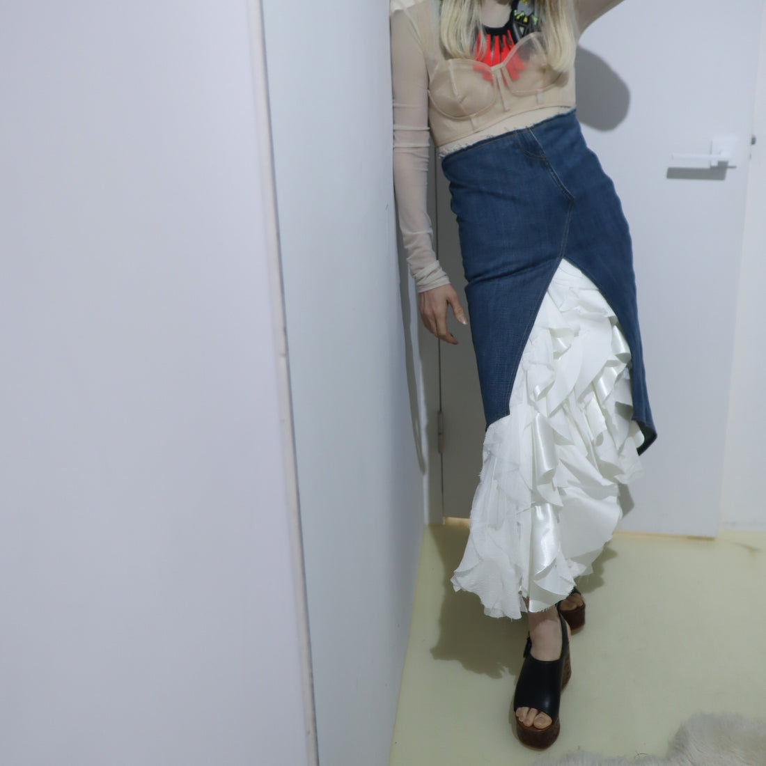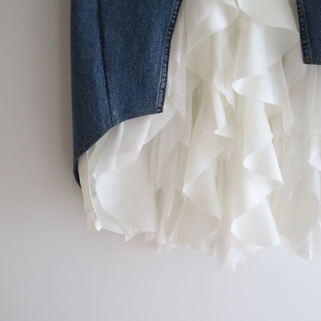様々な素材のフリルが大胆にあしらわれたデザインが印象的なデニムスカート。