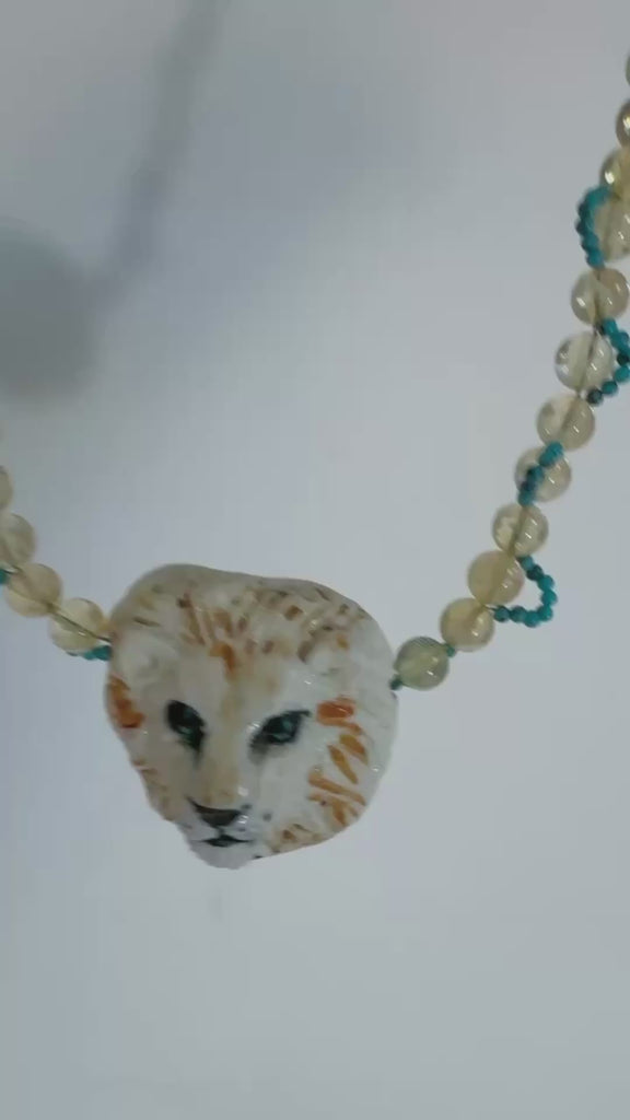 天然石のターコイズとシトリンの配色のコントラストがとても目を引くネックレス。ライオンの裏には美しいサンダルウッドがセットされています。